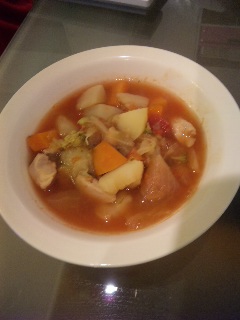 そこで!でかい具をちょっと小さくきりなおして、トマト缶を(今回は半分程にしました)入れて、スープにしてみると…