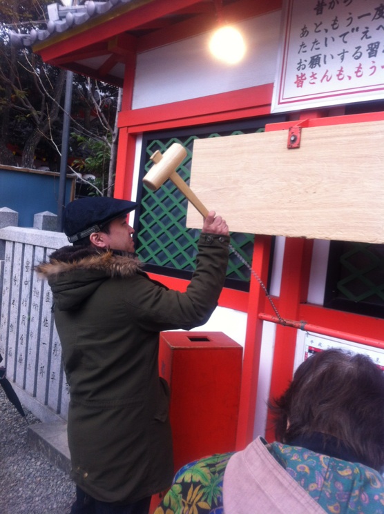 これ、「たたき板」といって、神社正面からお詣りしたあとに、本殿の裏にまわってこの板を(昔は下駄で)たたき、「えべっさん、たのんまっせ」とお願いするわけです。